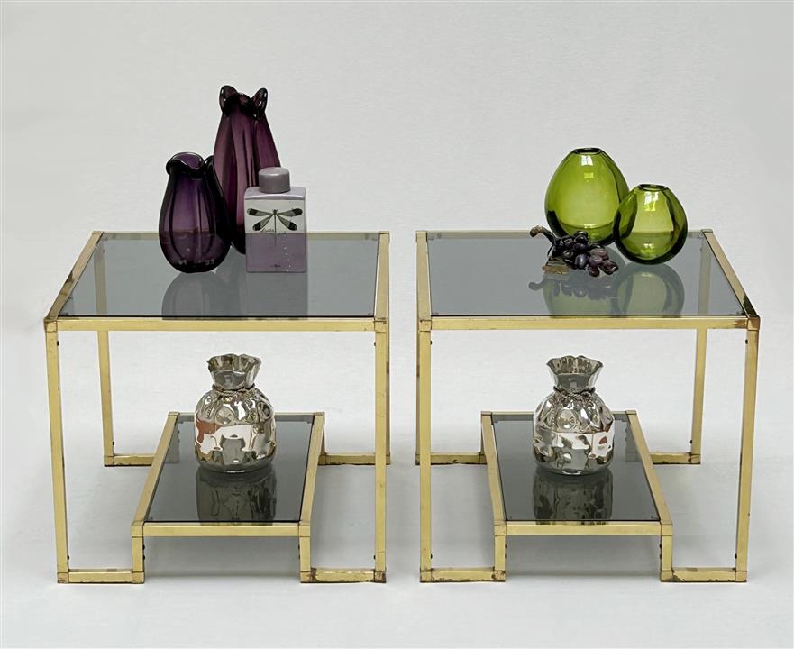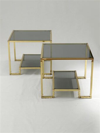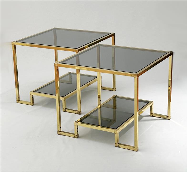 A pair of brass and glass side tables
