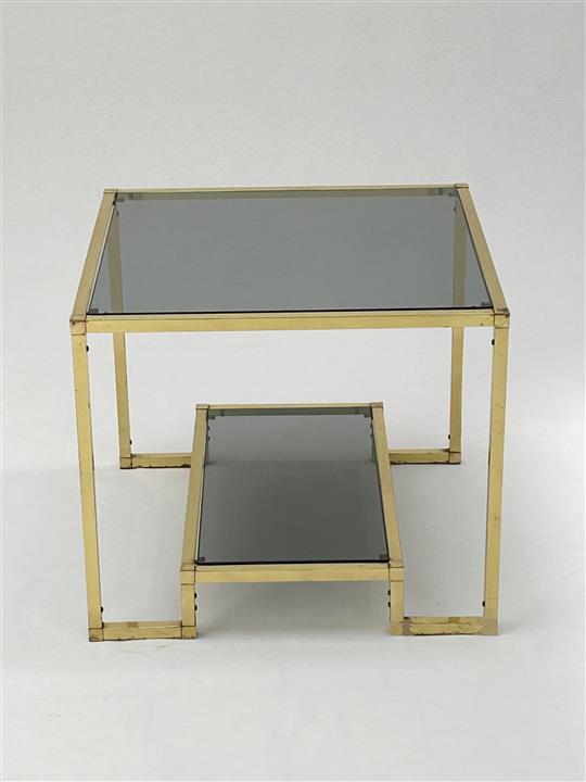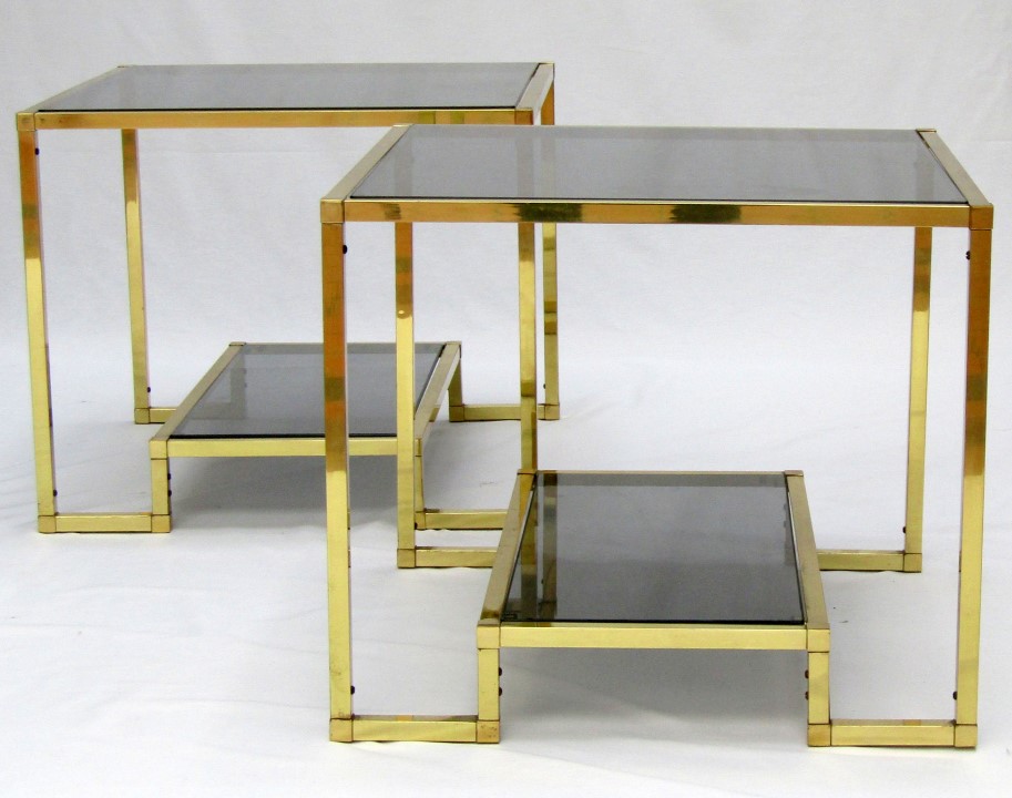 A pair of two tier smoked glass and brass